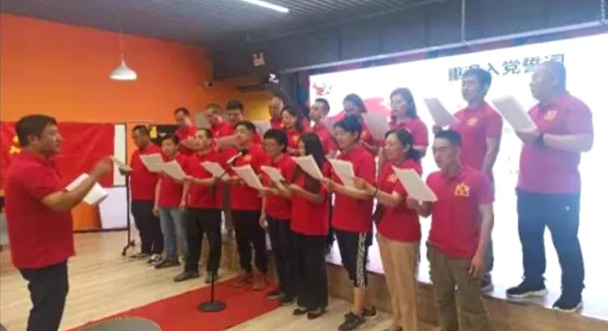 会后,是新党员入党宣誓及老党员重温入党誓词。在党群服务中心红色主题背景下,在领誓人刘泽君同志的带领下,全体党员紧握右拳,面向党旗庄严宣誓,铿锵有力的誓言响彻会场。