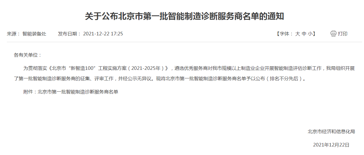 为贯彻落实《北京市“新智造100”工程实施方案(2021-2025)》,推动企业实施更大力度、更高层次的智能制造技术改造,遴选优秀服务商对市规模以上制造业企业开展智能制造评估诊断工作,北京市经济和信息化局于今年9月组织开展了诊断服务商的征集、评审工作。根据2021年12月22日公布的评审结果,诚益通成功入选“北京市第一批智能制造诊断服务商”。