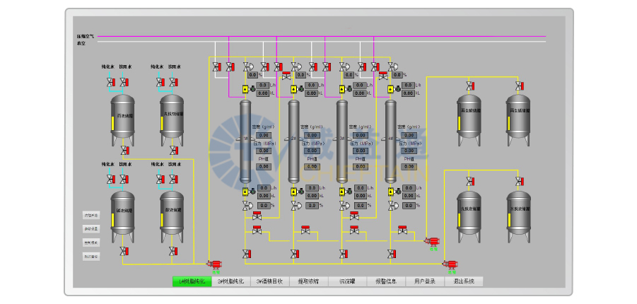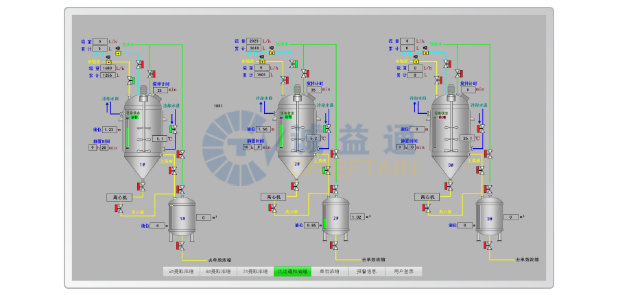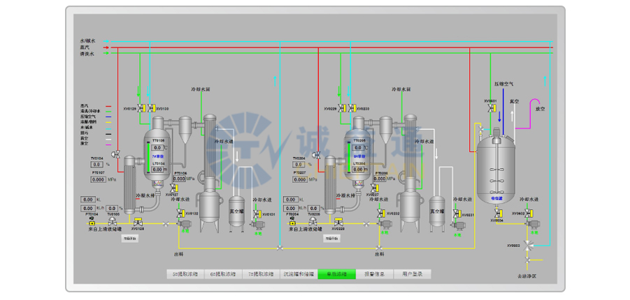 双效浓缩蒸发器工作在负压状况下,真空度、温度控制显得格外重要,在控制上以模糊控制和预测控制等控制理论为基础,建立模糊PID控制算法,对输入信号进行模糊化,经过模糊算法后,再对输出信号去模糊化同时结合操作工人的多年实际操作经验,实现优化控制,确保药液浓缩过程中既不会产生泡沫,又能最大限度地满足企业的质量及产能要求。