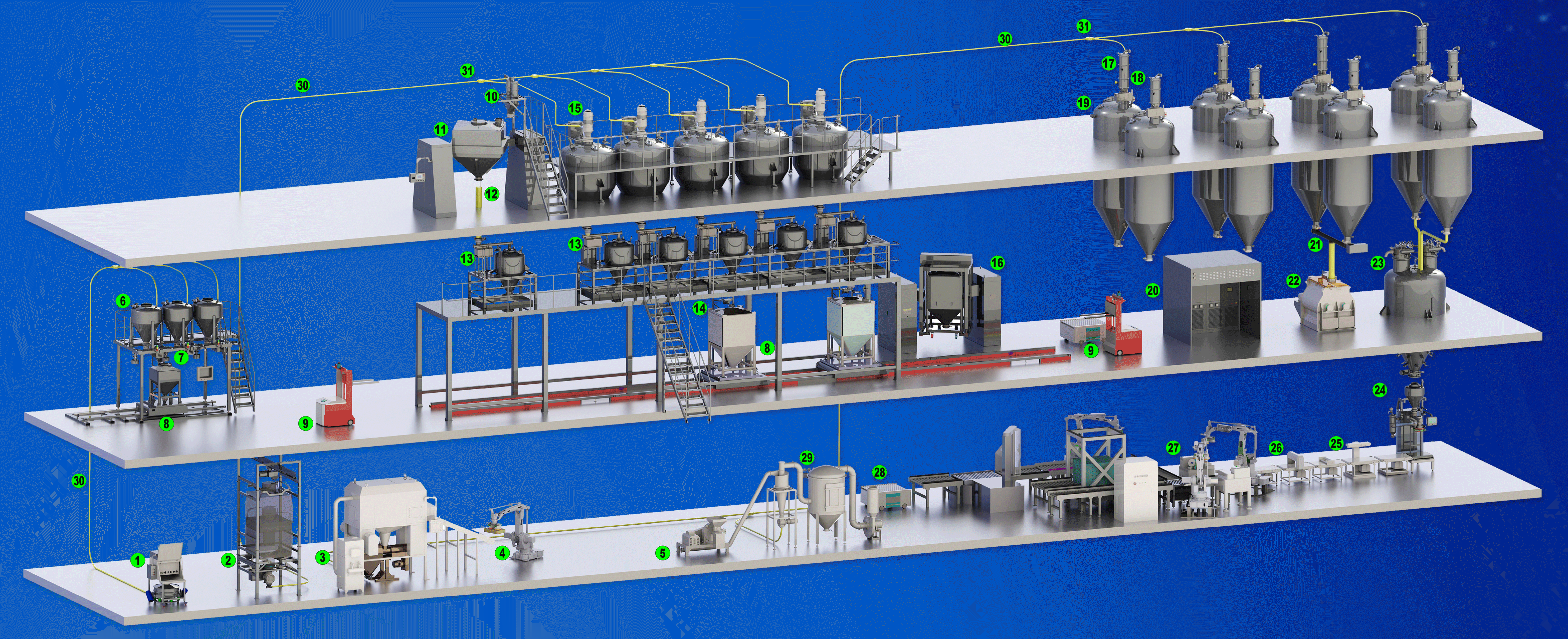 无尘粉碎系统 脉冲式气流混合系统 自动提升料斗混合机 无尘投料站 吨袋卸料机 真空输送设备 计量分装机 CIP清洗单元 代理设备—干法制粒机